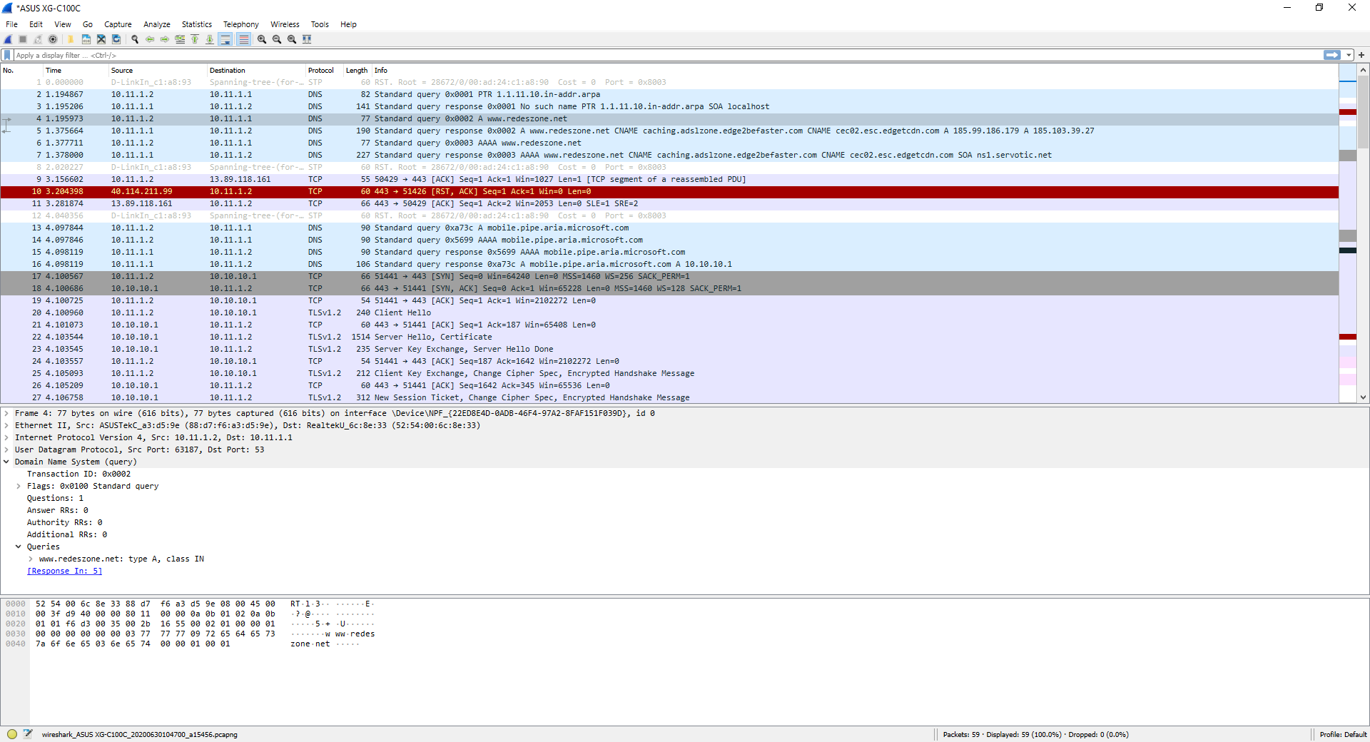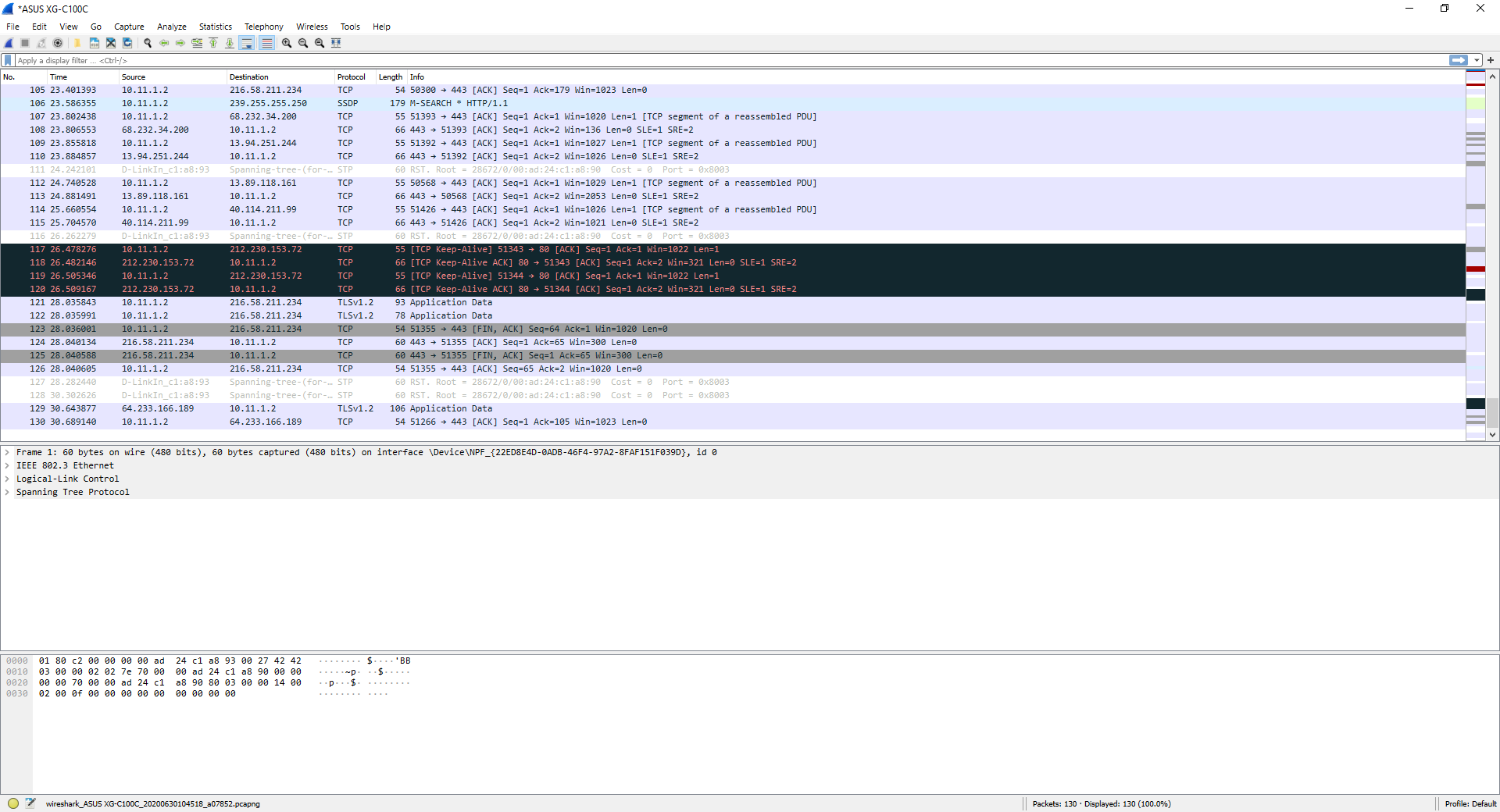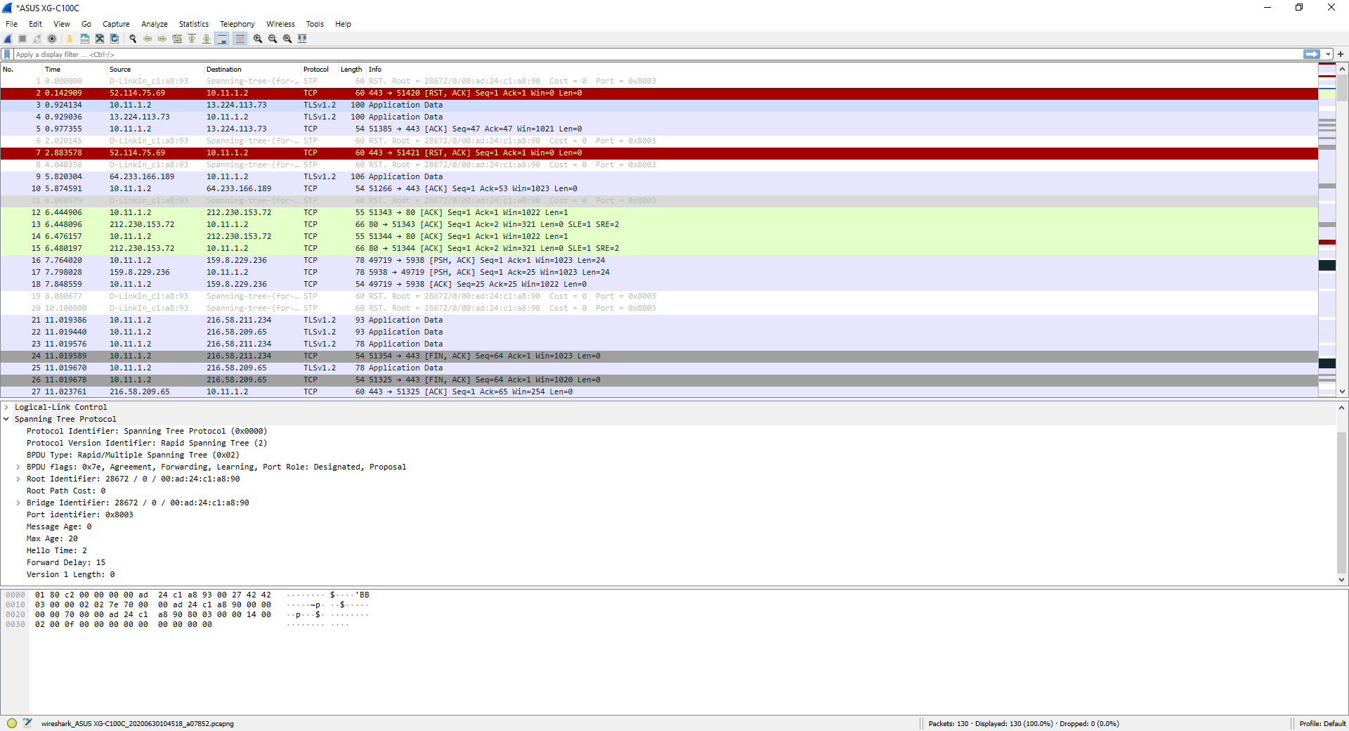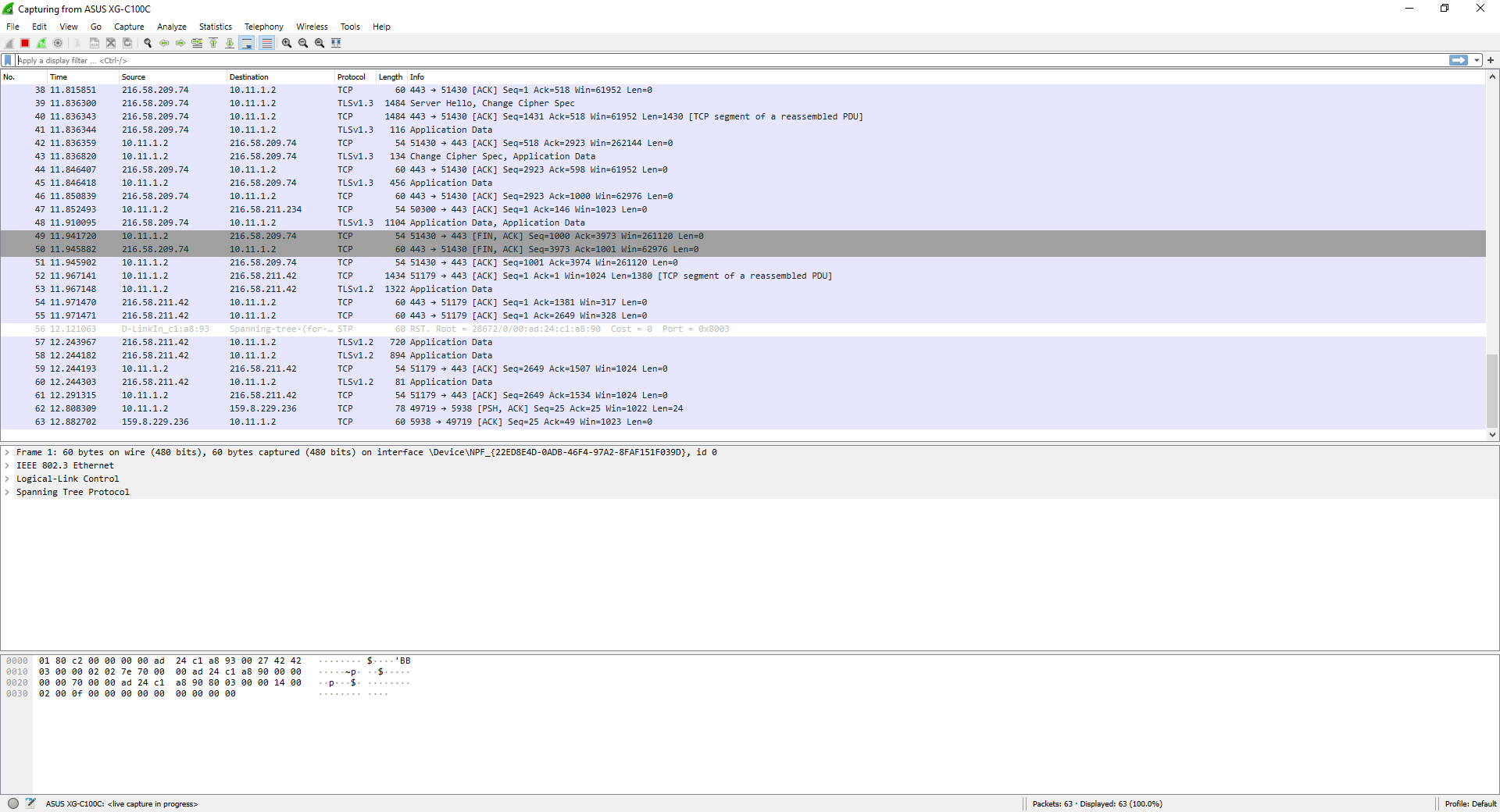 Dans cette capture de trafic, vous pouvez voir le trafic provenant de différents protocoles, à la fois le trafic réseau Spanning-Tree Protocol, ainsi que le trafic TCP et le trafic TLSv1.2 provenant de différentes applications que nous avons ouvertes.