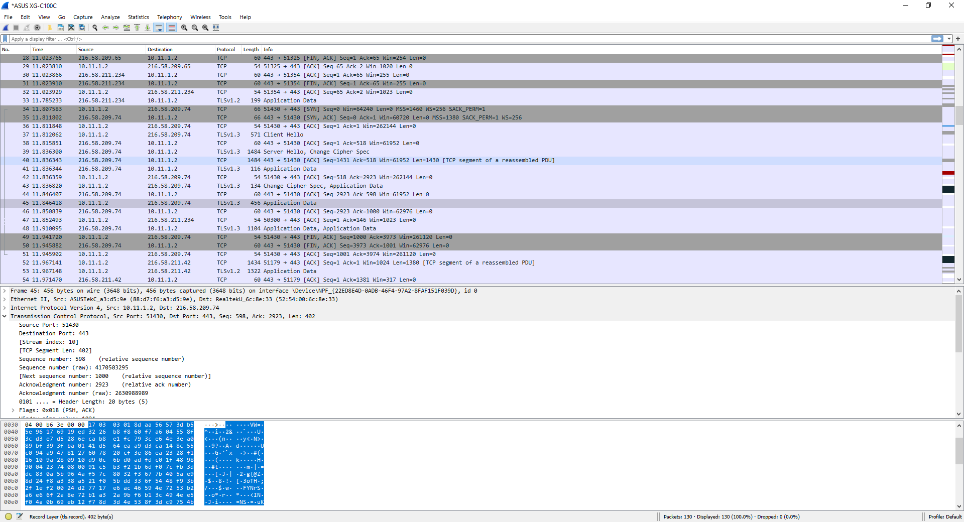 Wireshark nous permet de capturer le trafic de n’importe quelle carte réseau, qu’elle soit physique ou virtuelle, nous devons simplement savoir clairement quelle est notre carte réseau actuellement utilisée et à partir de laquelle nous voulons capturer le trafic réseau. Dans notre cas, il s’agit de l’ASUS XG-C100C, nous double-cliquons donc simplement sur cette carte.