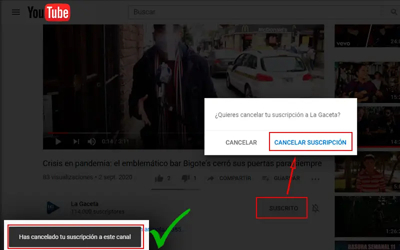 - Si vous avez effectué correctement les étapes précédentes, l’affiche «Vous avez annulé votre abonnement à cette chaîne» apparaîtra .