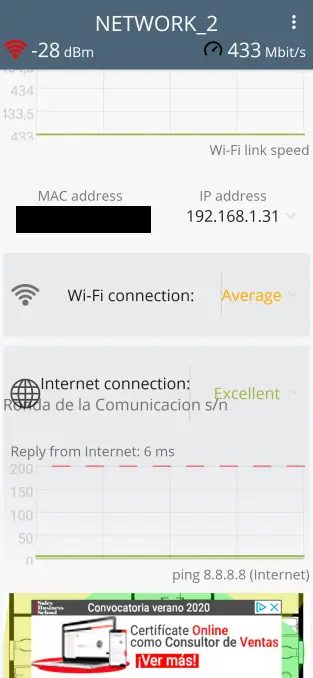 Le deuxième test est la connexion Internet et, avec un graphique en temps réel, il nous montrera que le temps de réponse est de 6 ms. Il le fait également en pingant l’IP 8.8.8.8 qui est l’un des serveurs DNS de Google.