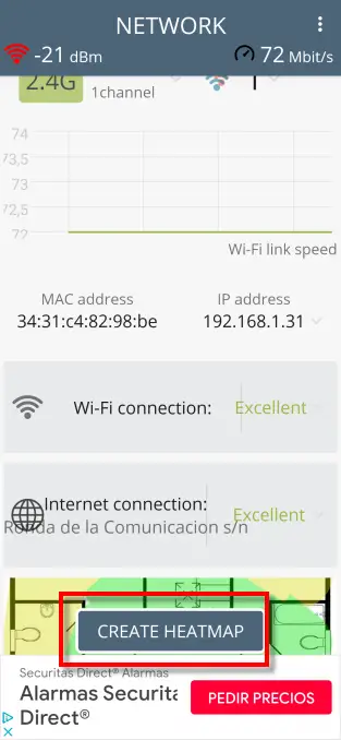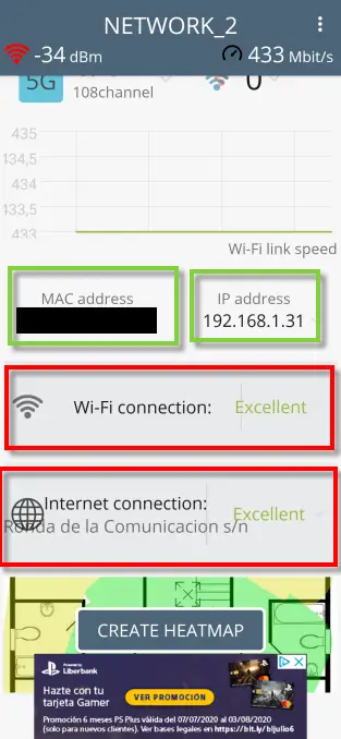 Si nous glissons notre doigt sur WiFi Heatmap, nous voyons comment notre adresse MAC apparaît à côté de l’adresse IP locale que nous avons à ce moment-là. Également dans une boîte rouge se trouvent les deux options que nous traiterons ci-dessous.