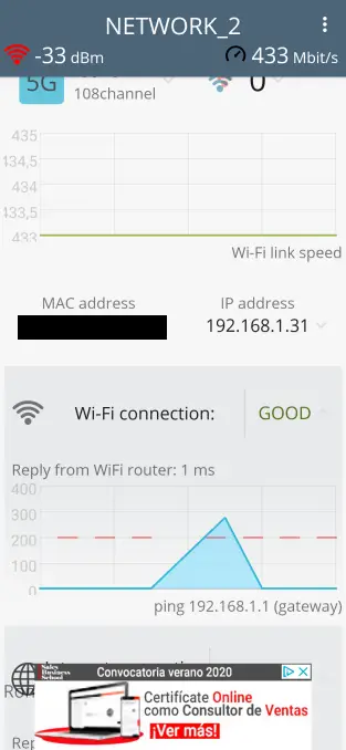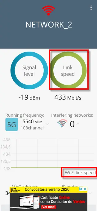 Si nous cliquons sur Link Speed nous verrons que nous sommes connectés à 433 Mbit/s et que nous avons un graphique en temps réel avec les variations de vitesse. Le reste des informations qu’il propose est le même que le précédent.