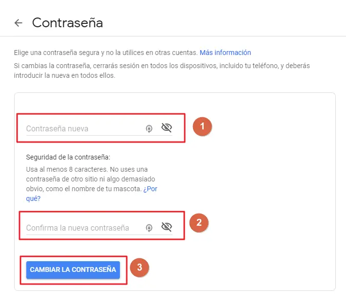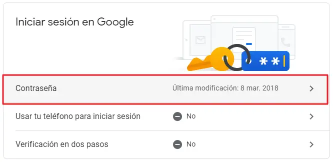 La première méthode que nous vous montrerons dans InfoCuentas est de changer votre mot de passe via le site officiel de Google, en vous connectant à votre compte et en accédant à la section correspondante. Pour cela, vous devrez connaître votre mot de passe actuel et avoir en tête un nouveau mot de passe aussi sécurisé que possible.