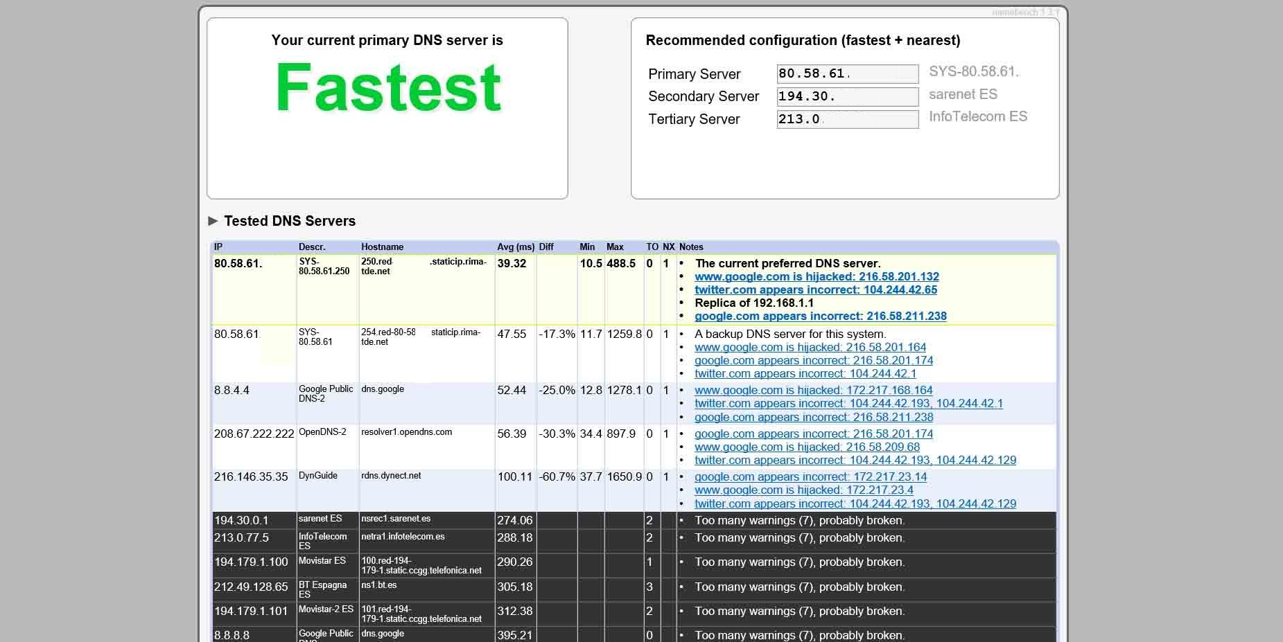 Au cas où cela montrerait que nous pouvons utiliser des serveurs DNS principaux et atteindre une meilleure vitesse, il apparaîtrait en mode pourcentage, pour savoir de combien cette vitesse pourrait augmenter. Si ceux que nous utilisons sont les meilleurs, cela nous montrera simplement qu’ils sont les plus rapides possibles.