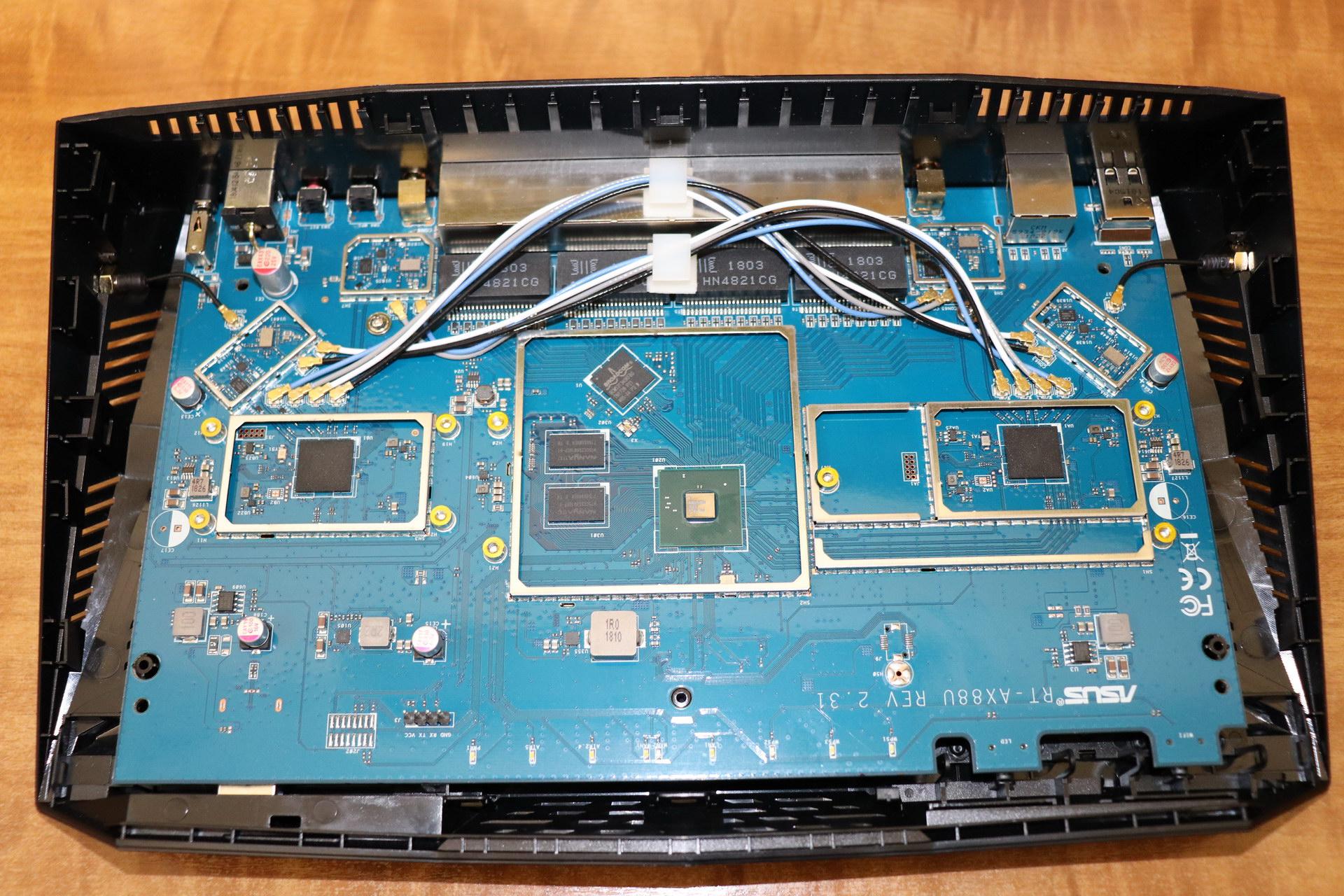 Lorsque les antennes sont externes, nous avons normalement le câble d’antenne qui est soudé ou à un connecteur UFL de l’amplificateur de puissance, au connecteur RP-SMA de l’antenne externe, que nous visserons plus tard pour avoir une couverture. Sur la photo suivante, vous pouvez voir le câble d’antenne (couleur noire) vers le connecteur RP-SMA du routeur ASUS RT-AX88U :