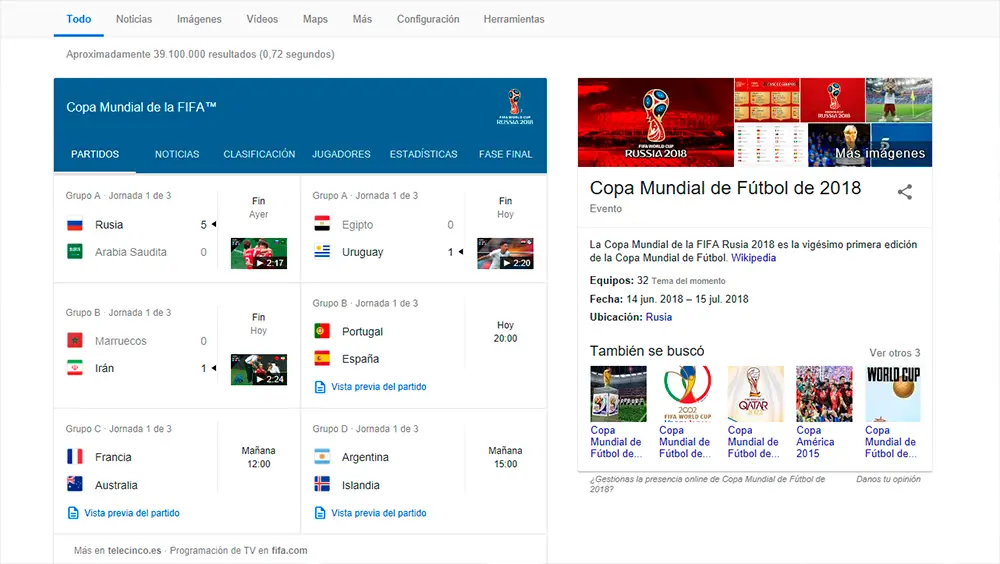 En raison du grand nombre de matchs et de leurs horaires, il se peut que nous ne puissions pas voir tous les matchs en direct, nous pouvons donc utiliser un autre moyen pour suivre tous les résultats au jour le jour et en temps réel. Pour ce faire, nous pouvons utiliser le moteur de recherche Google sans avoir à accéder à des sites Web spécifiques ou à d’autres canaux; Et c’est que Google propose tout au long de la Coupe du monde 2018 un bloc spécial dédié aux matchs quotidiens , avec le calendrier et les résultats mis à jour minute par minute.