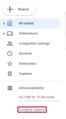 - Sur la plateforme Google Drive, cliquez sur le bouton » Acheter de l’espace «. De cette façon, vous accéderez aux plans et aux services.