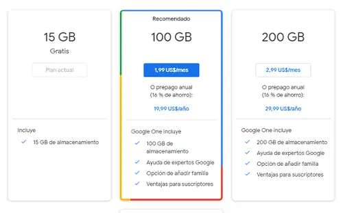 Google divise ses forfaits et services en fonction des besoins de chaque utilisateur , lors de l’utilisation de cette plate-forme de stockage de manière personnelle. Il faut souligner que leur valeur varie selon votre région. Si vous souhaitez connaître les services disponibles dans votre pays, cliquez surici .