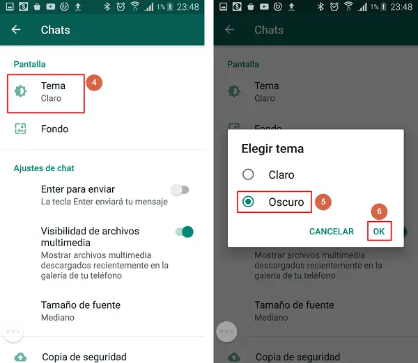 - Choisissez simplement l’option sombre, cliquez sur «Ok» . Intelligent! votre WhatsApp aura déjà activé le mode nuit .