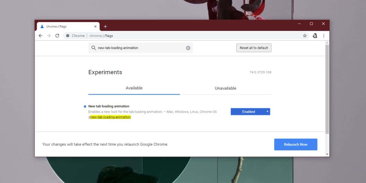 Les résultats de la recherche renverront le nouvel indicateur d’animation de chargement d’onglet. Ouvrez le menu déroulant à côté et sélectionnez Activé. Cliquez sur le bouton Redémarrer pour redémarrer Chrome.