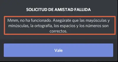 6. Dans le cas où la demande n’a pas été envoyée , une nouvelle fenêtre apparaîtra intitulée « Demande d’amitié échouée » dans laquelle vous serez invité à vérifier l’ orthographe , les lettres majuscules et minuscules , les chiffres, etc.
