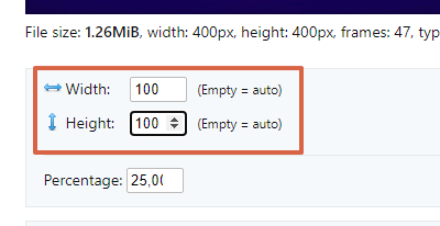 - Lorsque le GIF se charge, écrivez 100 à la fois dans « Largeur » et « Hauteur ». Cela réduira le GIF à la taille autorisée par Discord.