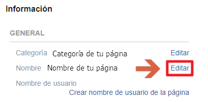 2. Une fois dans l’onglet d’information, les données générales de votre page apparaîtront ; Dans le secteur » Général » , qui est le premier, vous pourrez voir la catégorie et le nom de votre page, ainsi que deux options qui disent » Modifier «, dans ce cas, vous devez cliquer sur le second .