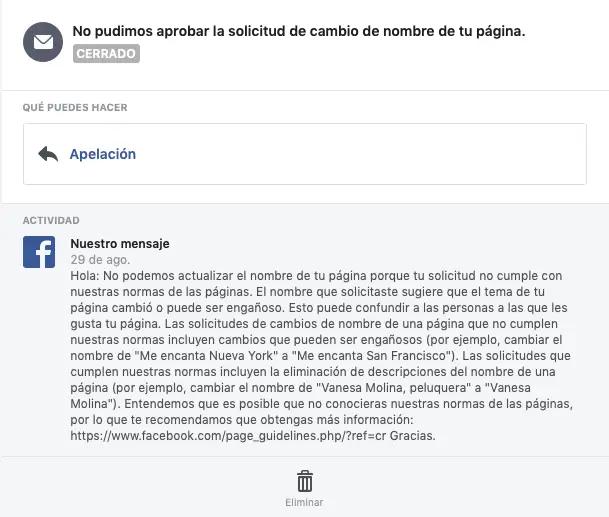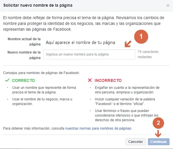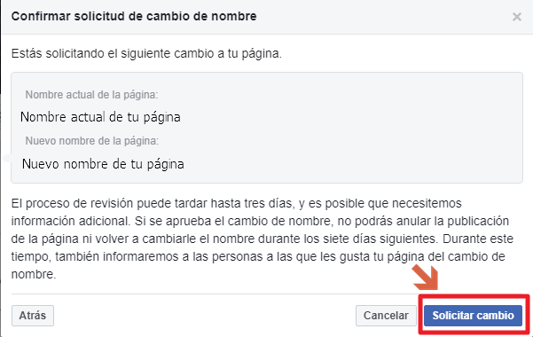 1. Si vous souhaitez changer le thème de votre page, en commençant par le nom, essayez de le faire petit à petit (en plusieurs changements). Si votre page s’appelle » Monde du sport » et que vous souhaitez la changer en » La cuisine de María «, il est fort probable qu’elle sera rejetée. La chose recommandée serait, par exemple : faire un premier changement en » Mundo María » puis, en laissant passer une semaine, un deuxième changement dans lequel on remplace » Mundo » par » La cocina de «.