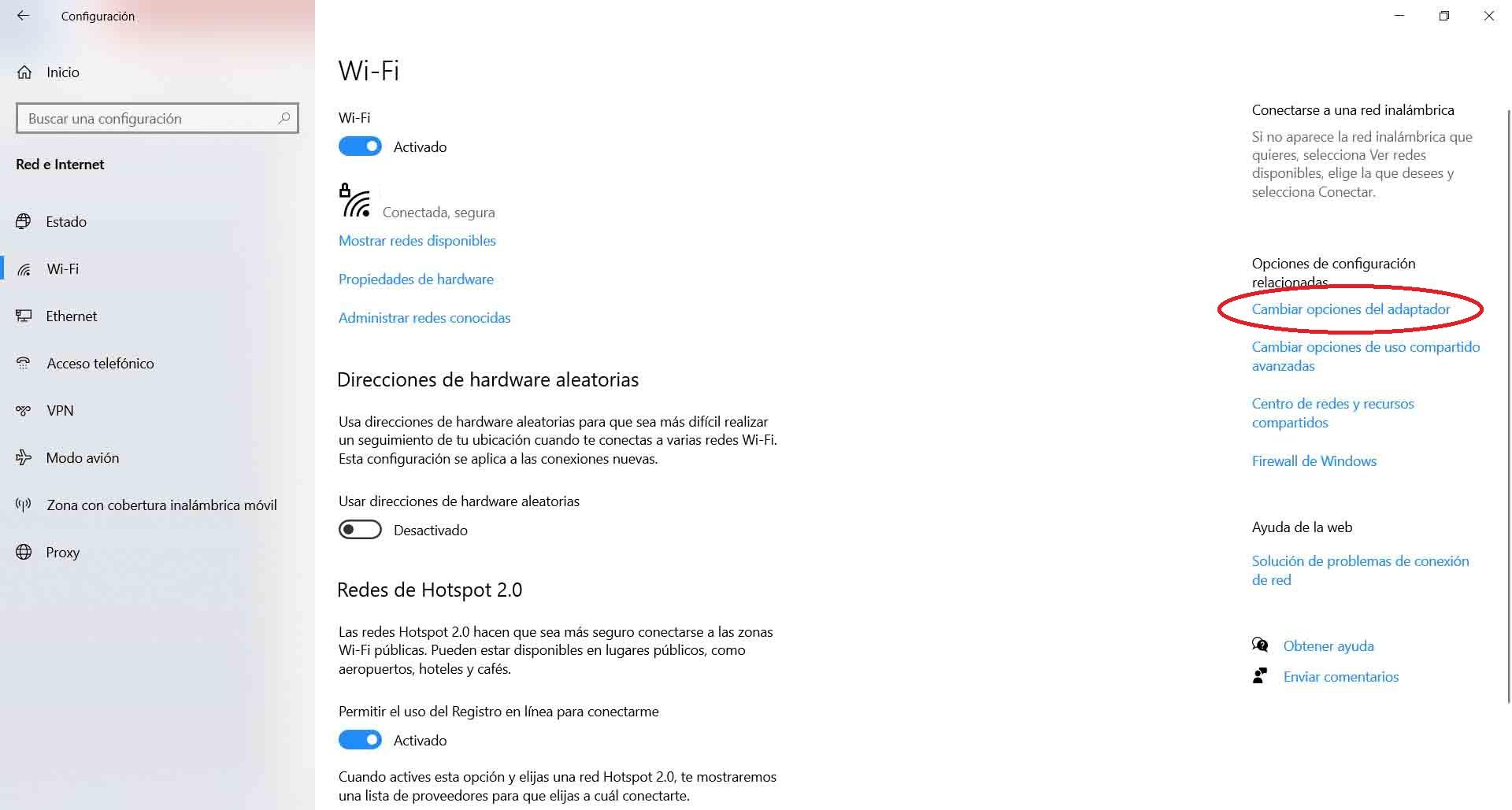 La première chose que nous devons faire est d’aller dans Démarrer , entrez Paramètres , Réseau et Internet et cliquez sur Wi-Fi . Plus tard, nous cliquons sur Modifier les options de l’adaptateur , qui apparaît à droite.