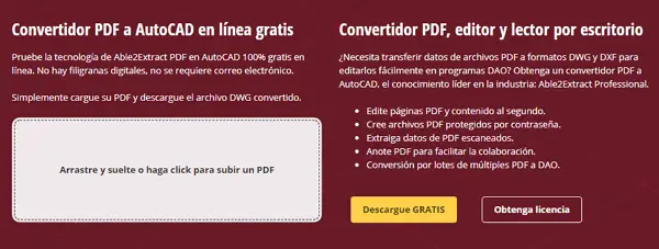 Il s’agit d’une page qui vous permet de convertir des fichiers PDF en DWG sans vous inscrire . La principale caractéristique de ce site est qu’il est compatible avec une grande variété de formats , puisqu’il en existe plus de 50 et uniquement dans la catégorie des documents. Online Convert Free fonctionne également avec des livres, des fichiers, des audios, des vidéos et des images, cela peut donc être un outil allié pour toute conversion que vous souhaitez effectuer.