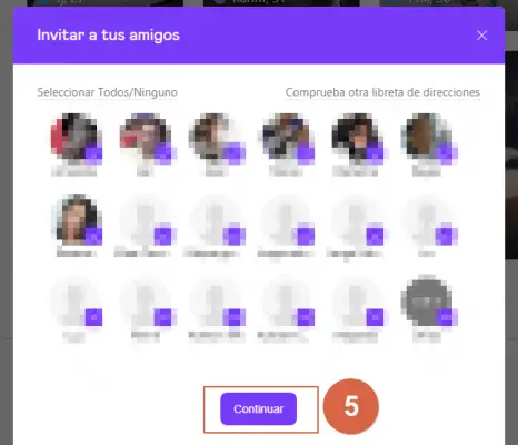 - Sélectionnez qui vous souhaitez inviter à essayer ce fantastique réseau social et cliquez sur «Continuer» . Cela enverra un message à chacun d’eux sous votre nom, leur demandant de rejoindre votre liste d’amis sur Badoo.