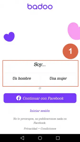 - Sélectionnez votre sexe (Homme ou Femme) dans la fenêtre principale de Badoo et passez à l’étape suivante.