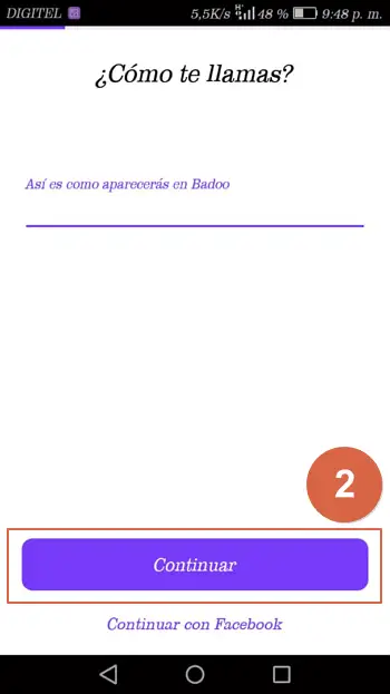 - Écrivez votre nom dans le champ vide et appuyez sur «Continuer» . Gardez à l’esprit que c’est ainsi que les autres utilisateurs vous verront sur la plateforme Badoo.