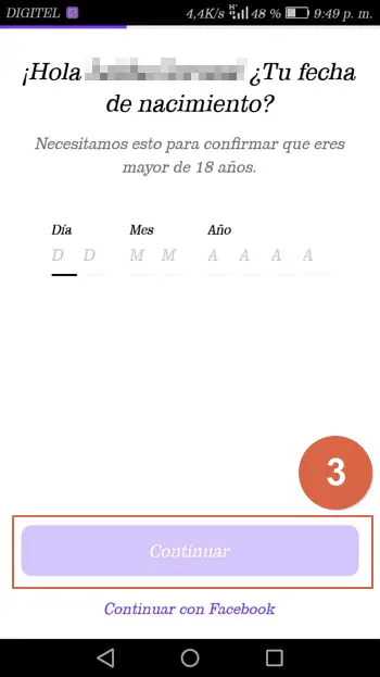 - Dans la fenêtre suivante, vous devrez indiquer votre date de naissance pour vérifier que vous respectez la limite d’âge nécessaire (18 ans) . Écrivez à l’aide du clavier de votre téléphone, en suivant le format de l’application.