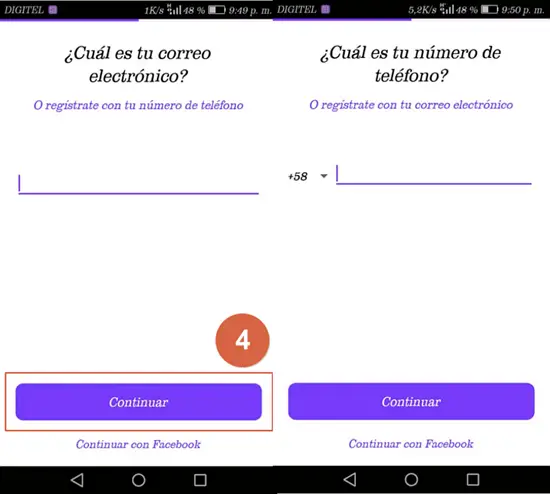 - Il vous sera demandé d’ entrer votre email . Si, pour une raison quelconque, vous préférez vous inscrire en utilisant une autre alternative, vous pouvez modifier cela en cliquant sur « Ou inscrivez-vous avec votre numéro de téléphone » . L’application changera automatiquement et vous continuerez le processus en appuyant sur «Continuer» .