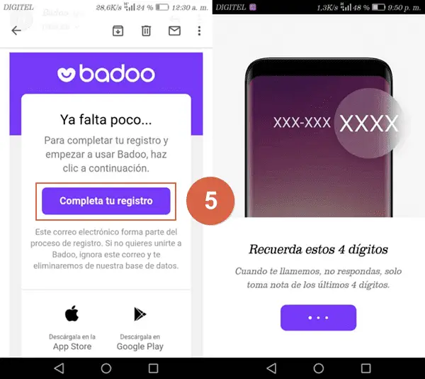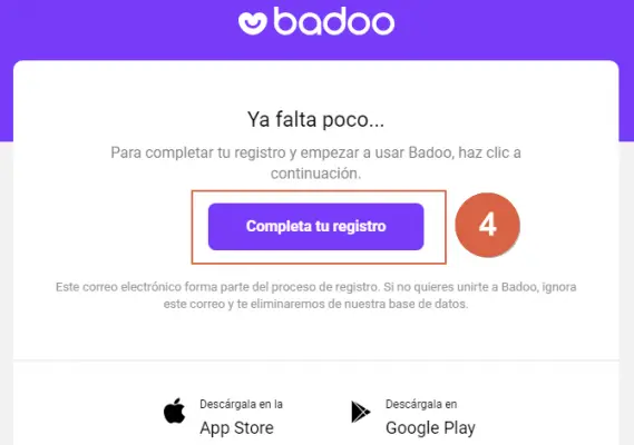 - À ce stade, Badoo vous enverra un e-mail, vous devez donc vous rendre dans votre boîte de réception et confirmer l’enregistrement . Vous pouvez le faire directement à partir de l’option disponible sur le web. Remarque : Si vous avez décidé d’ utiliser votre numéro de téléphone au lieu de l’e-mail, vous recevrez un SMS ou un appel avec un code spécial qui vous permettra de terminer cette étape. Notez les 4 derniers chiffres de la personne qui vous appelle et écrivez-les à l’endroit indiqué.