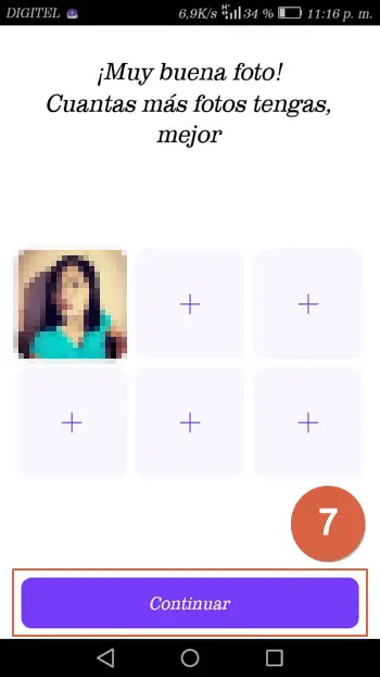 - Le site recommande un minimum de 6 photos pour se démarquer des autres et avoir une meilleure visibilité sur Badoo. Si vous n’avez pas une liste aussi complète de fichiers, ne vous inquiétez pas, appuyez simplement sur «Continuer».