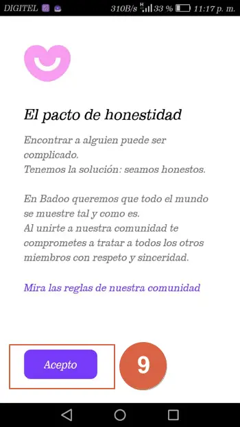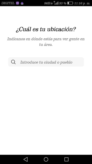 - La prochaine chose à faire est d’ indiquer votre emplacement . Pour y parvenir il vous suffira de cliquer sur la case avec le message «Entrez votre ville ou commune» et d’écrire le nom du lieu où vous vous trouvez. Grâce à votre connexion Internet, Badoo filtrera les données et vous proposera l’option exacte , cliquez dessus et c’est tout. Ces informations sont nécessaires pour segmenter vos amis potentiels en fonction de la zone dans laquelle vous vous trouvez.