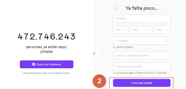 - On vous montrera un formulaire que vous devrez remplir avec vos informations personnelles (Nom, date de naissance, e-mail ou numéro de téléphone, localisation et le mot de passe que vous utiliserez). Remplissez chacun des champs et cliquez sur «Créer un compte».