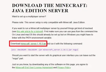 - Accédez au site officiel de Minecraft en faisant cliquez ici pour télécharger le serveur Minecraft. Une fois sur la page, cliquez sur la section » Télécharger Minecraft server.1.16.5.jar «.