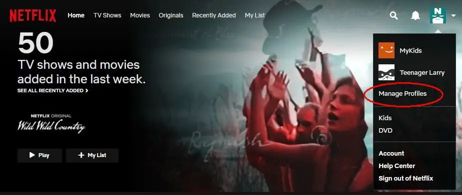 Depuis l’écran de navigation d’accueil, déplacez votre souris vers le coin supérieur droit et survolez l’icône de votre profil Netflix . Un menu déroulant devrait apparaître. Cliquez sur le bouton Gérer les profils ci-dessous pour voir une grille de vos icônes de profil actuel au centre de l’écran.