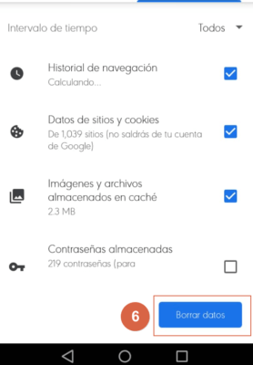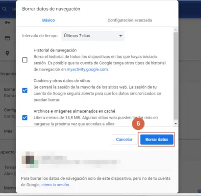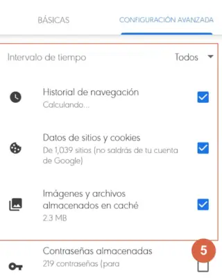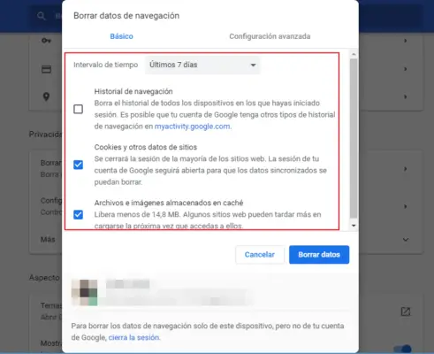 - Une fenêtre contextuelle s’affichera dans laquelle vous devrez saisir les informations que vous souhaitez supprimer, en choisissant parmi une liste d’alternatives : Intervalle de temps : Correspond au moment à partir duquel vous souhaitez supprimer les informations stockées, pouvant choisir entre «la dernière heure» à «pour toujours» simplement en affichant la liste des options. Historique de navigation : Si vous souhaitez supprimer l’historique de toutes les pages que vous avez visitées pour empêcher quelqu’un d’autre de les voir, vous devez cocher cette case, sinon ignorez cette option. Cookies et autres données du site : Ceci est marqué par défaut, car c’est la raison principale pour les utilisateurs.