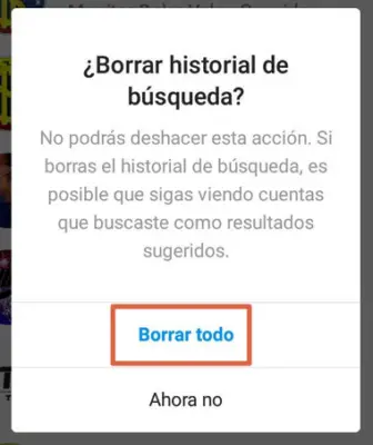 - Instagram vous montrera un avertissement, vous indiquant qu’il s’agit d’un processus irréversible. Confirmez votre décision en cliquant sur » Tout supprimer «. Ce faisant, tout votre historique de recherche et vos suggestions éventuelles appartiendront au passé.