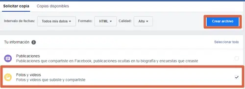 - Ensuite, vous devez choisir la période pour laquelle vous souhaitez une copie des photos, le format et la qualité . Par défaut, le téléchargement est paramétré pour toutes vos données dès l’ouverture du compte sur Facebook, au format HTML et en Haute qualité. Assurez-vous de décocher les autres options pour copier uniquement les fichiers multimédias que vous avez partagés. Une fois cela fait, cliquez sur » Créer un fichier «.