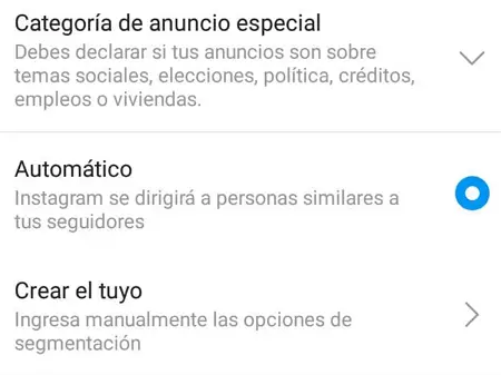 Il est important de mentionner qu’Instagram dispose d’une fonction «Ciblage automatique» . Qui se charge de séparer la cible de votre annonce, en fonction des données géographiques, démographiques, comportementales ou psychologiques fournies par vous lors de sa création.