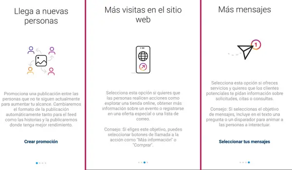Pour cela, Instagram vous propose une série d’alternatives que vous pouvez prendre en compte lors de la définition de vos objectifs commerciaux , parmi lesquelles :