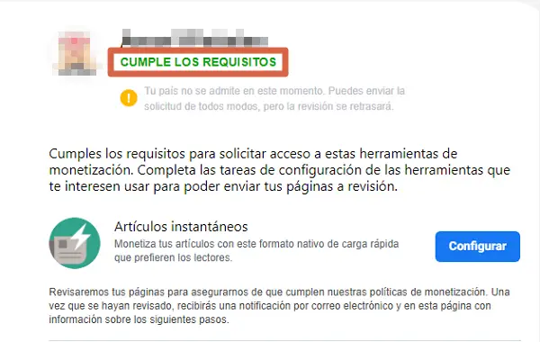 Dans le cas où il répond aux exigences exigées par Facebook, vous verrez un indicateur vert avec la phrase « Il répond aux exigences » . De la même manière, si le pays dans lequel vous vous trouvez prend en charge la monétisation à partir du réseau social, vous ne verrez aucune observation ou message lié à ce sujet.