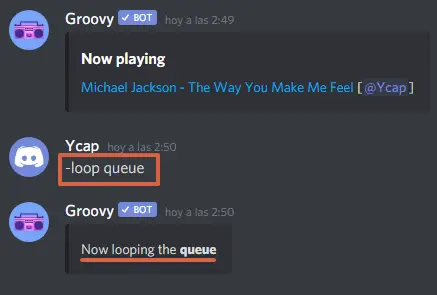 - Si vous avez recherché plusieurs chansons, et que vous voulez à jouer en boucle , comme envoyer un message de « -loop file d’ attente ».