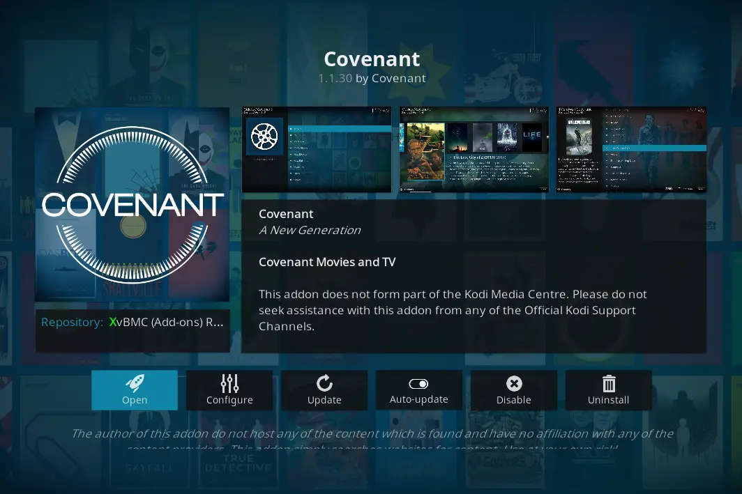 Covenant est l’un des modules complémentaires les plus populaires pour Kodi et peut être utilisé pour diffuser des films et des épisodes d’émissions de télévision. La gamme de films est large et comprend les films Disney les plus populaires pour le streaming. C’est pourquoi nous l’avons choisi comme le meilleur addon Kodi pour regarder Disney. Voici comment installer le plugin: