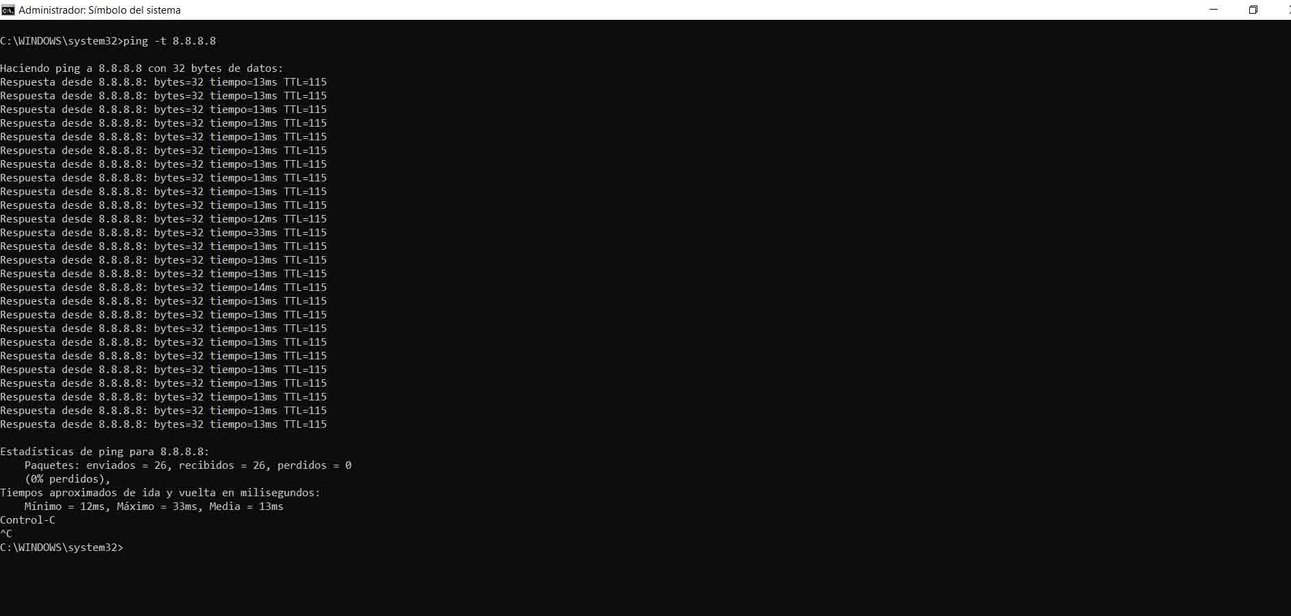 Pour cela, nous devons exécuter la commande ping –t 8.8.8.8 . Le paramètre -t doit envoyer un ping indéfiniment et ainsi pouvoir vérifier les pannes Wi-Fi continues. 8.8.8.8 sont les serveurs de Google, bien que nous puissions en utiliser.