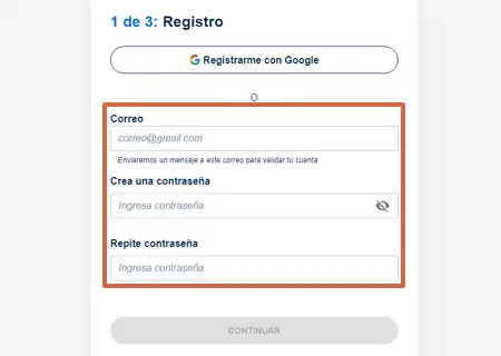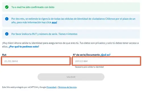 - Entrez votre RUT, votre numéro de série d’identification et votre e-mail . Acceptez les conditions générales d’utilisation et les politiques de traitement des données personnelles. À son tour, effectuez le reCAPTCHA que la plateforme demandera et appuyez sur » Continuer «.