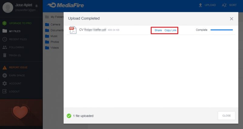 Après avoir téléchargé un fichier, vous pouvez copier son URL et le partager comme vous le souhaitez. N’oubliez pas que si vous avez un compte gratuit, les fichiers que vous téléchargez sur MediaFire ont une limite de poids de 200 Mo.