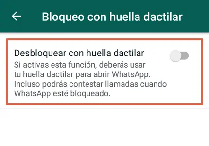 Remarque : avant de passer à l’étape 6, vous devez d’abord configurer l’empreinte digitale sur votre appareil intelligent. Si ce n’est pas le cas, WhatsApp vous demandera de configurer une empreinte digitale pour poursuivre le processus. Pour le configurer il faut suivre ce chemin sur le téléphone : » Paramètres > Sécurité > Empreinte digitale «. - Appuyez sur le bouton pour activer l’option » Déverrouiller avec empreinte digitale «.
