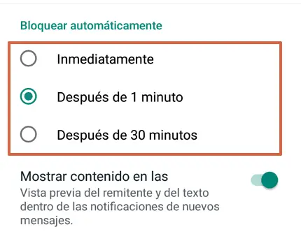 - Choisissez si vous souhaitez bloquer WhatsApp automatiquement après une minute, 30 minutes ou immédiatement. Vous pouvez également choisir si vous souhaitez voir les messages reçus via l’aperçu sur l’écran initial.