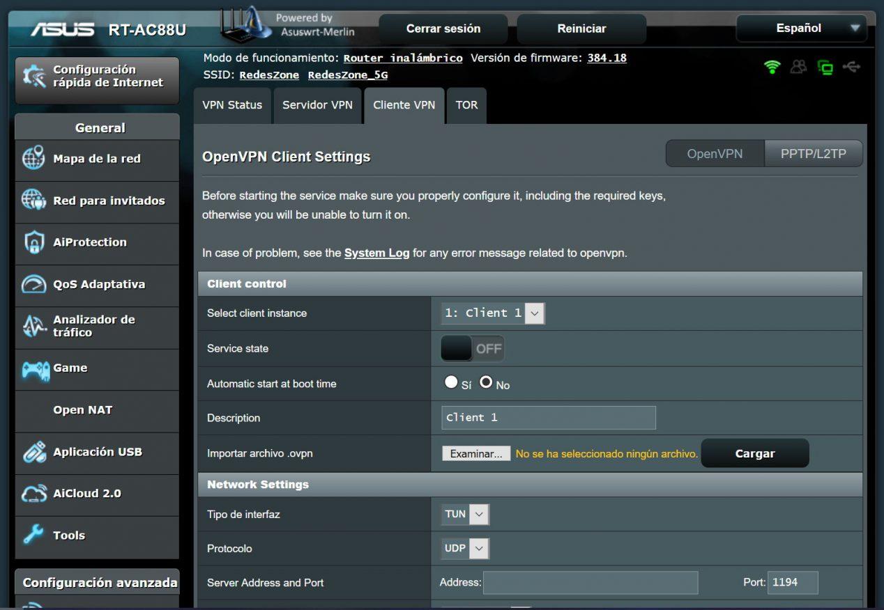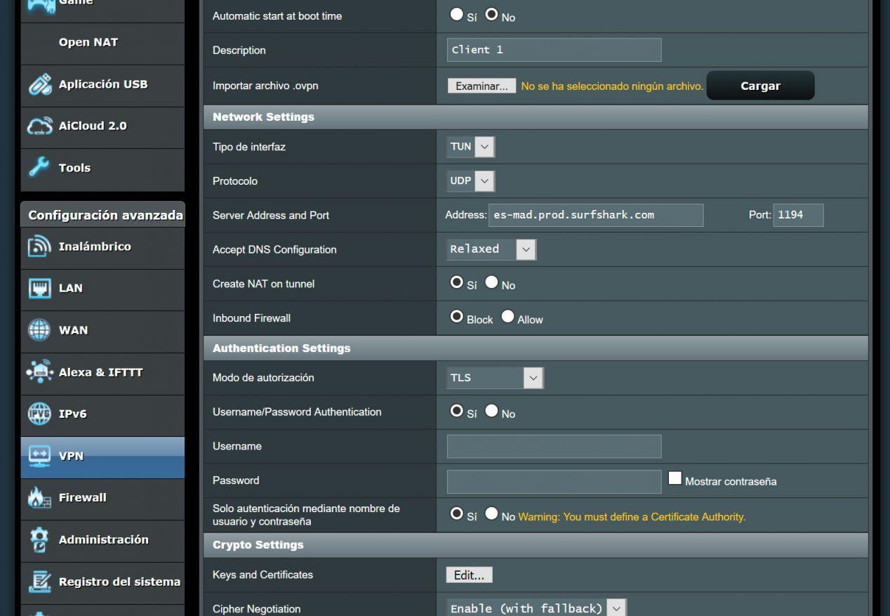 Une fois que nous avons téléchargé la configuration depuis le site officiel, ainsi que les informations d’identification pour accéder au service VPN, nous procédons à la configuration du routeur ASUS en mode client OpenVPN.