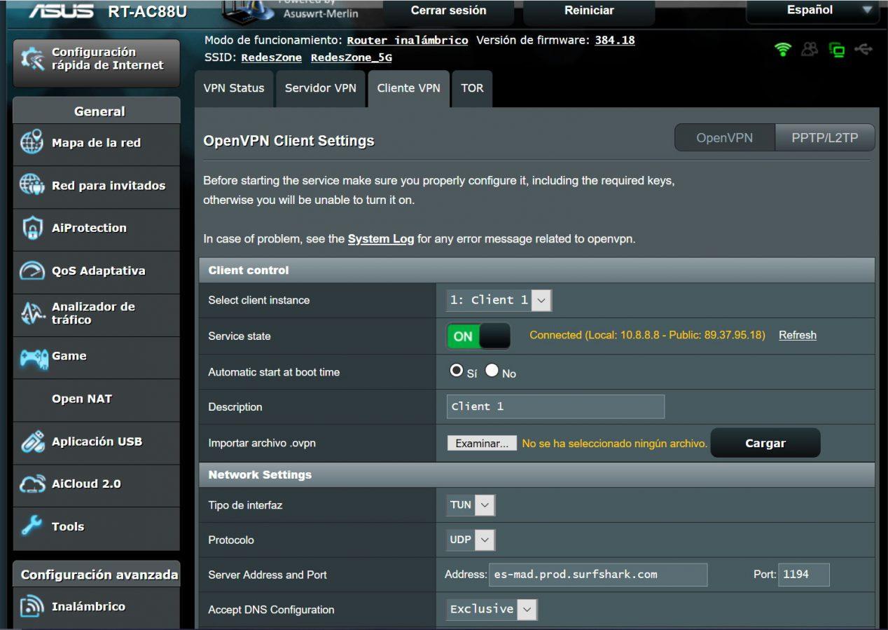 Une fois que nous avons configuré le routeur ASUS en mode client OpenVPN avec le service VPN Surfshark , nous procédons à la vérification de ses performances.