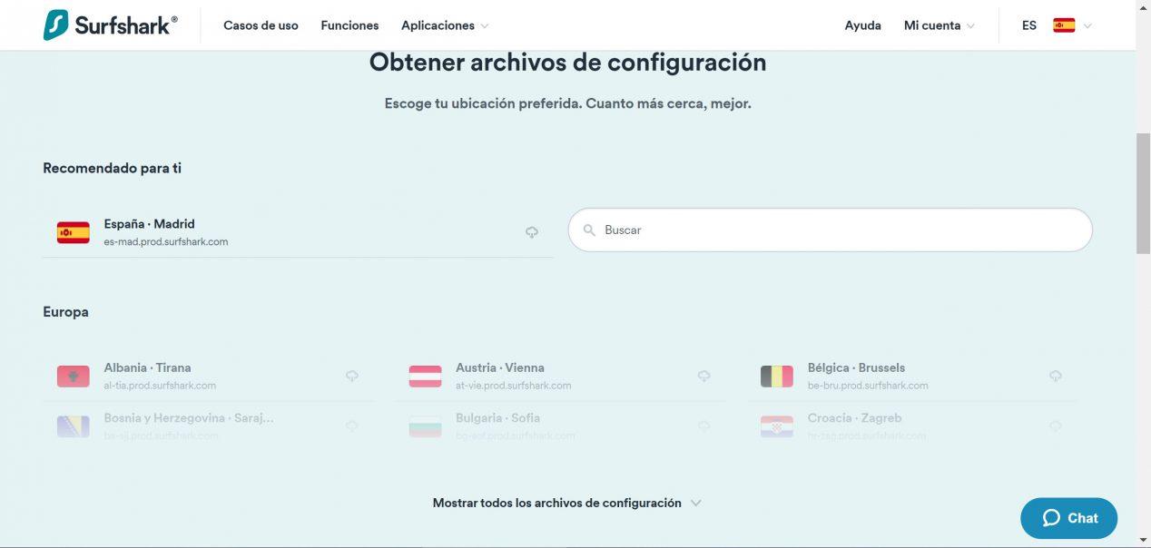 En bas, nous pouvons voir les différents profils OpenVPN avec une extension .ovpn que nous pouvons télécharger. Selon l’endroit où nous voulons nous connecter, nous devrons utiliser certains fichiers de configuration ou d’autres. Le système reconnaît automatiquement (par notre adresse IP publique) que notre serveur OpenVPN géographiquement le plus proche est Madrid, mais nous pouvons choisir celui que nous voulons.
