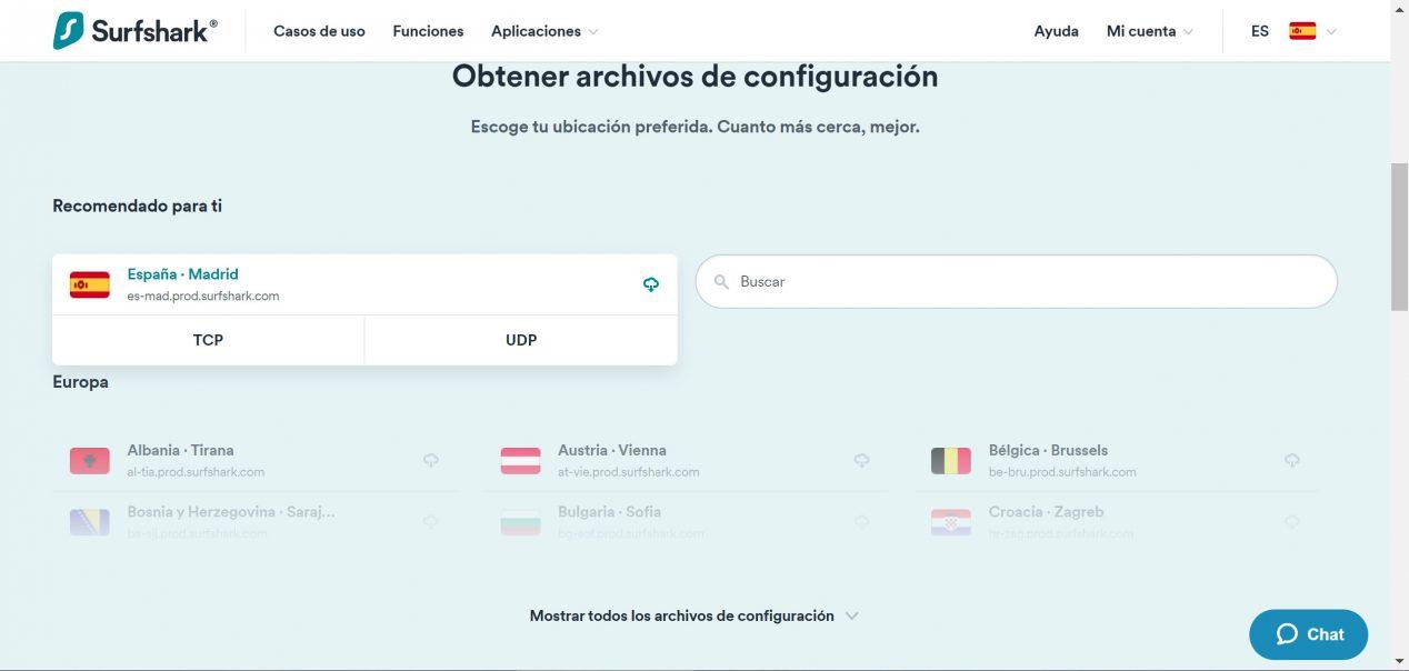Si nous cliquons sur Madrid, nous pouvons télécharger la configuration OpenVPN, que nous utilisions le protocole de couche de transport TCP, ainsi que UDP. Il est conseillé de toujours choisir UDP car il nous fournira de meilleures performances en termes de vitesse de téléchargement, de vitesse de téléchargement et améliorera également quelque peu la latence de connexion.