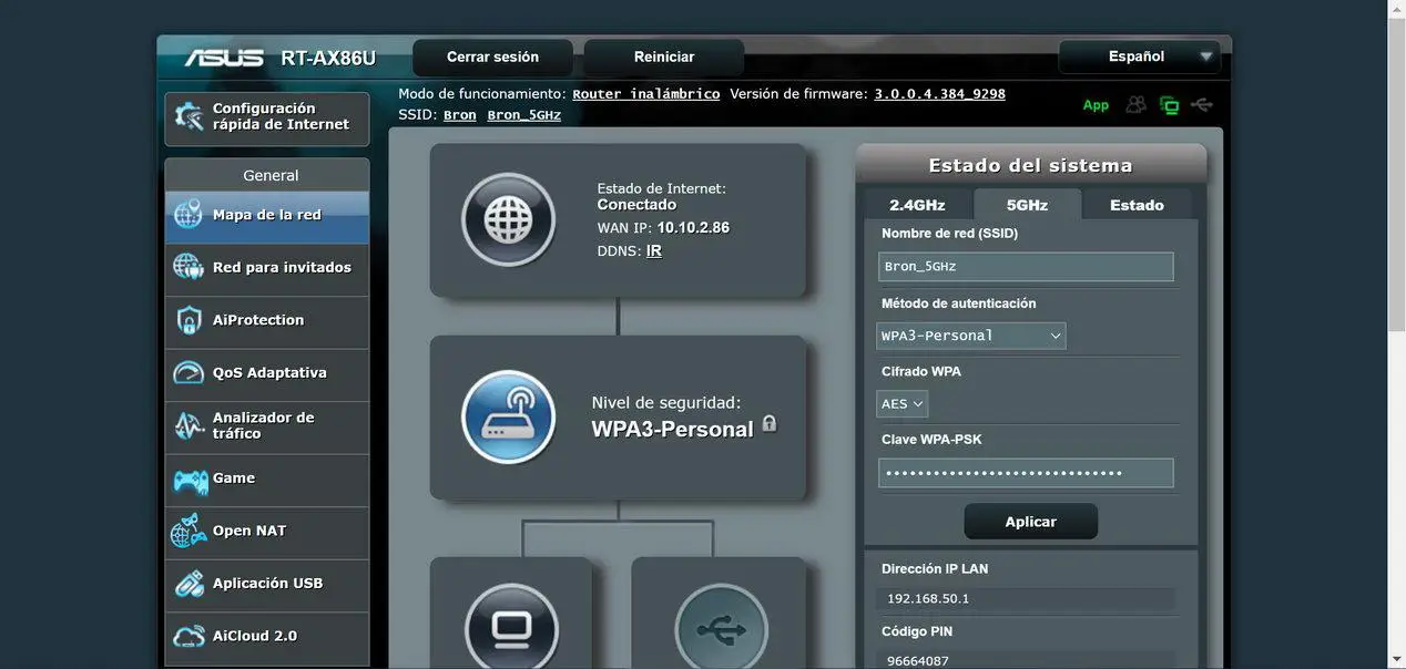 Une fois à l’intérieur, nous devons aller dans la section » Sans fil / Sécurité «, dans le cas d’ASUS, nous pouvons modifier la configuration directement depuis le menu principal, dans la section » État du système » et en cliquant sur chacune des deux bandes de fréquences, nous pouvons facilement changer la sécurité.