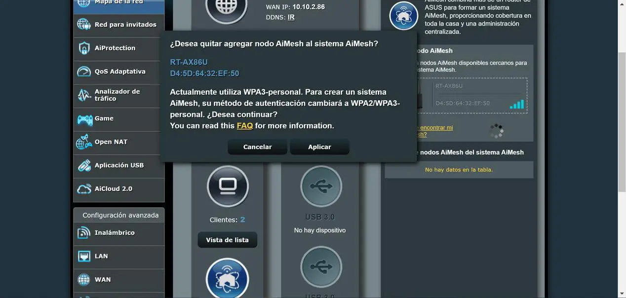 En el caso de los ASUS, si tenemos una red Wi-Fi AiMesh, tendremos que seleccionar sí o sí el modo WPA2-Personal o el modo WPA2/WPA3-Personal, ya que este sistema Wi-Fi Mesh no soporta actualmente WPA3-Personal uniquement. Le firmware lui-même nous en avertira, si nous voulons AiMesh, il est nécessaire d’activer la rétrocompatibilité, en sélectionnant WPA2 / WPA3-Personal.